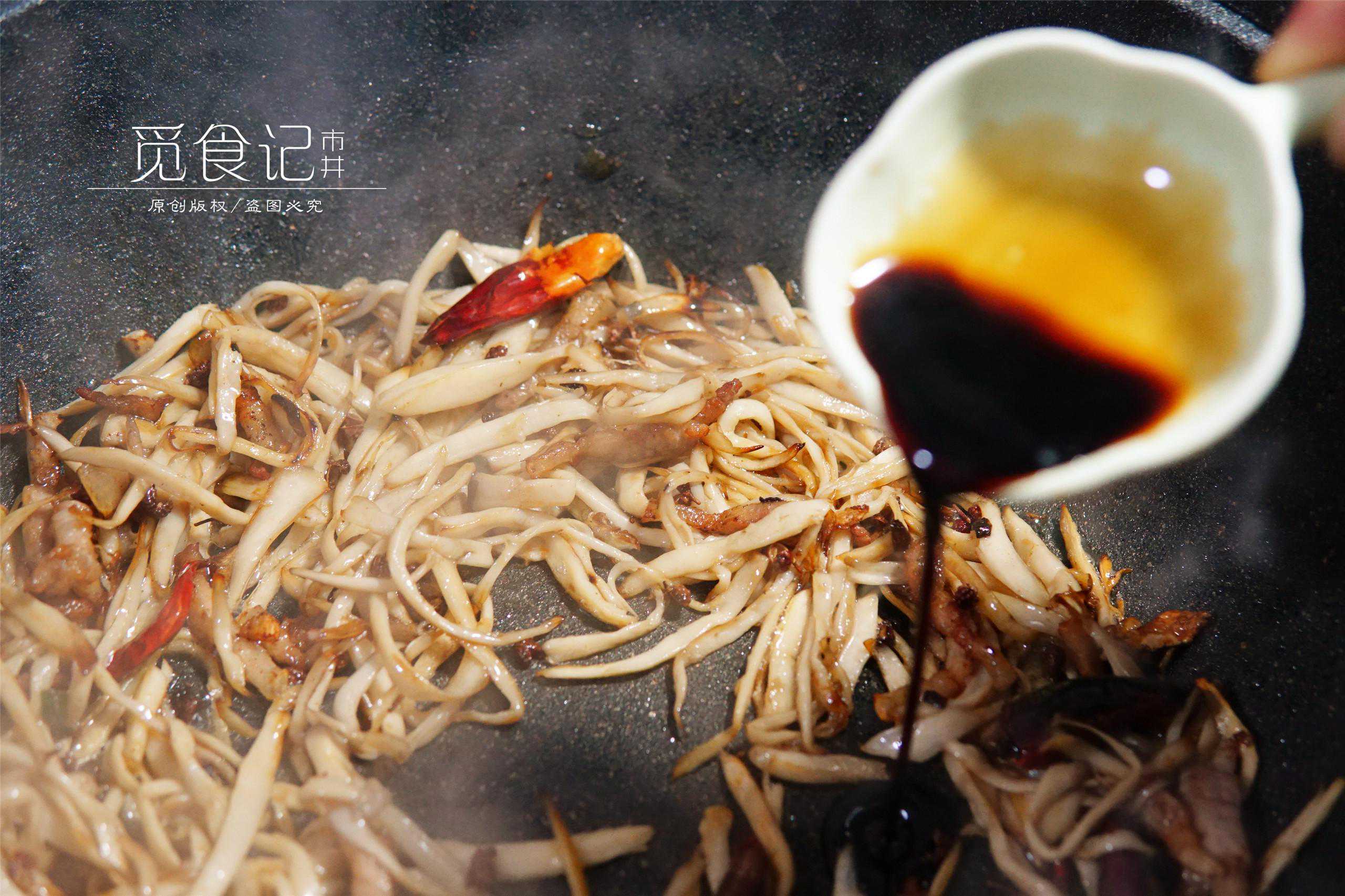 第四步炒杏鲍菇,肉丝炒好以后,倒入加工过的杏鲍菇略微翻炒一下,根据杏鲍菇的量,加入一勺左右的生抽、一勺酱油,一勺蚝油,半勺糖,半勺胡椒粉,口味重的可以再加入一些盐,大火翻炒至汤汁完全吸收,一盘焦香鲜美的干煸杏鲍菇就做好了。