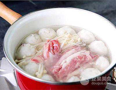 2、水煮开后,依次放入墨鱼丸,金针菇和肥牛