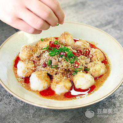 5、将调好的酱料淋到墨鱼丸和肥牛上,淋上辣椒油