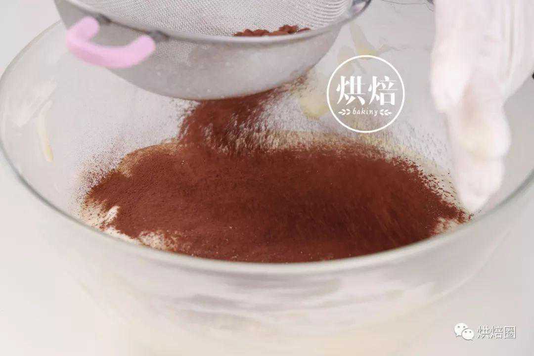⑨把蛋糕糊一分为二,每份的重量为325g,其中一份筛入可可粉,翻拌均匀。