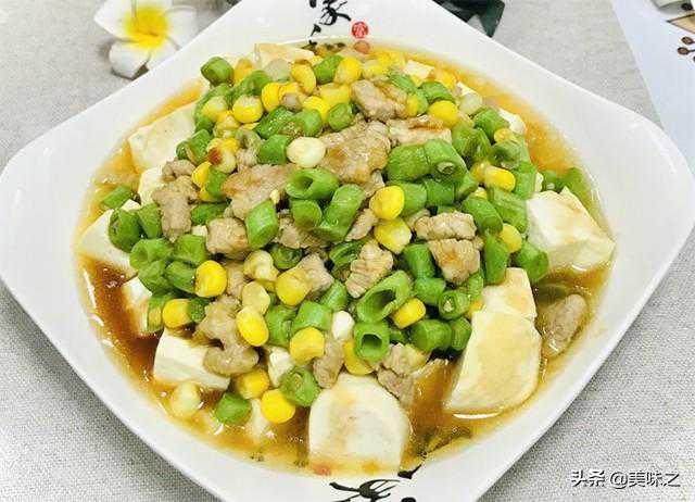 玉米半截、豇豆3条、肉末40g、豆腐1块、生粉1匙、酱油1匙、蚝油1匙。