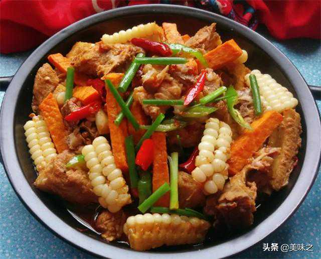 熟排骨适量、糯玉米一根、红薯半块、青红椒适量、小葱段适量、花椒适量、姜适量、麻辣牛油火锅底料适量、盐适量、生抽适量、老抽适量、蒜适量。