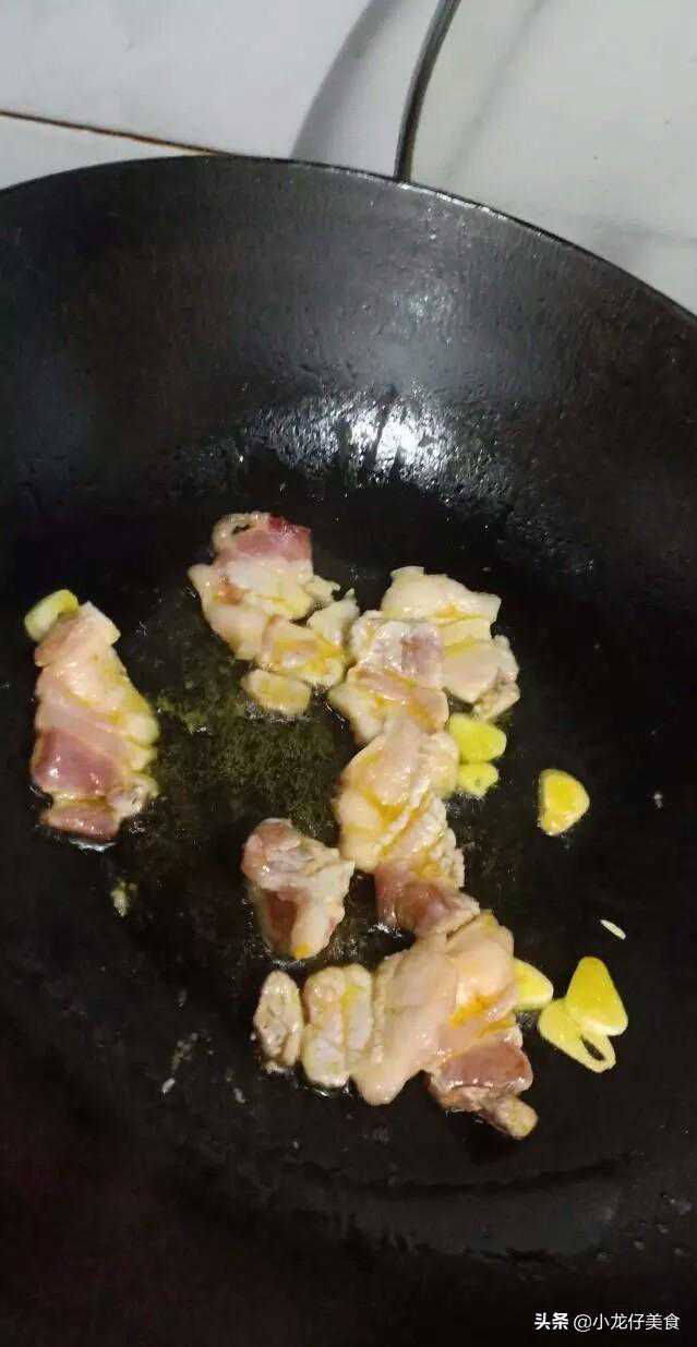 2.倒入事先切好的五花肉片,快速翻炒至肉色改变,加入一点清水,把肉稍微炖一下。