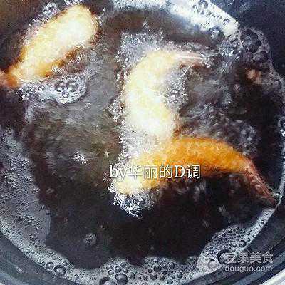 6、把虾先沾干面粉,再沾面糊,接着裹上面包糠下油锅。