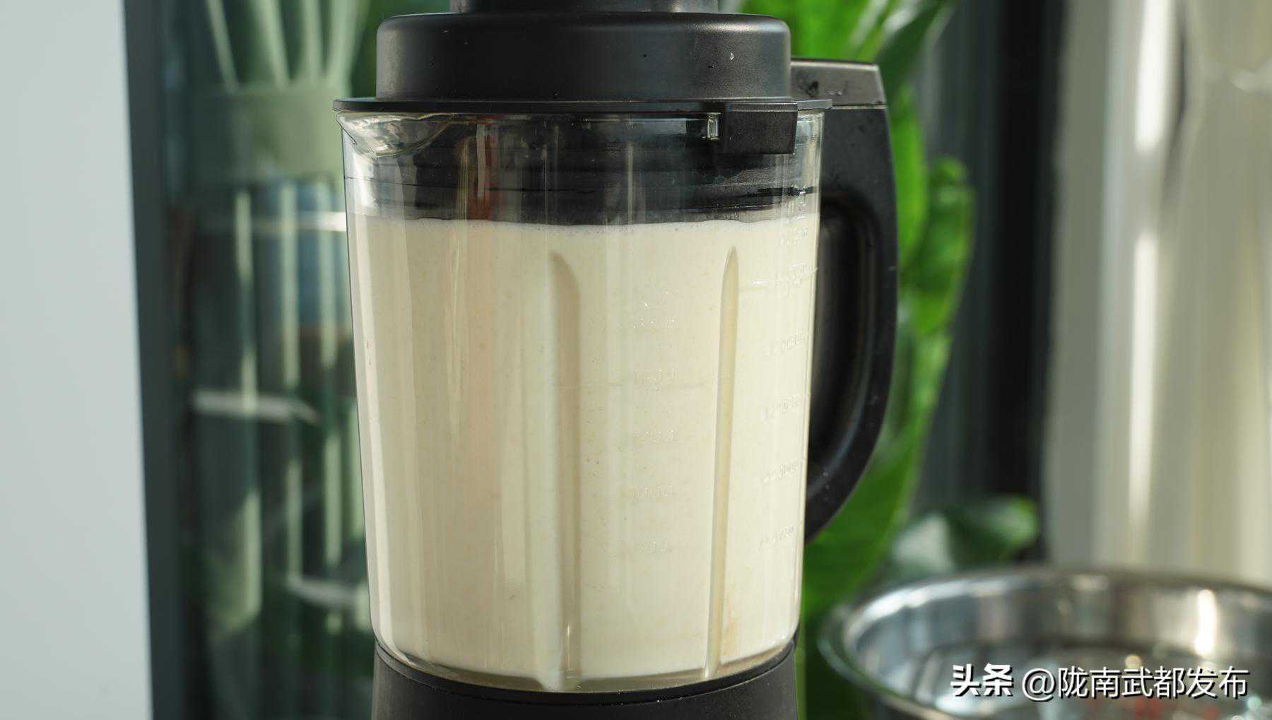 3、然后倒入破壁机中,按1斤黄豆7斤水的比例打成细腻的生豆浆。