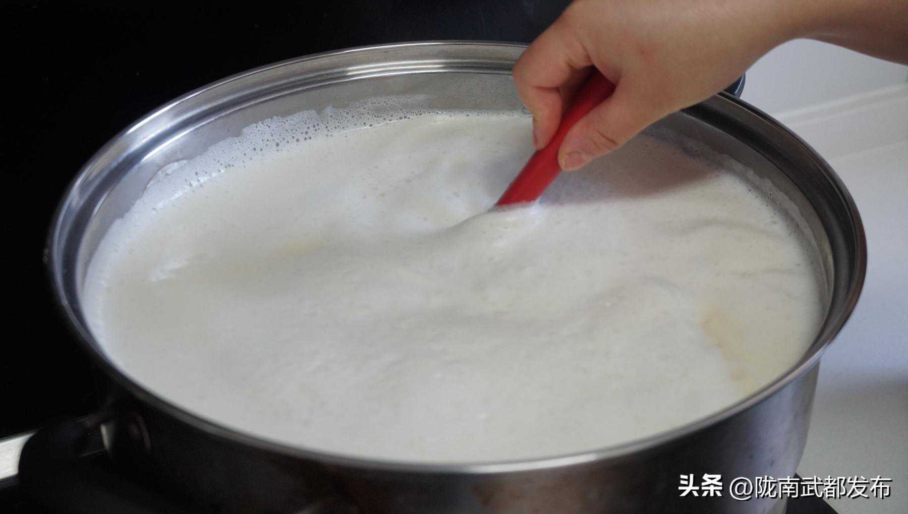 1、豆浆过滤好后就可以开始煮了,边煮边搅拌,浮沫记得打去。豆浆煮开了不要关火,再继续煮个5分钟,把豆浆完全煮沸。