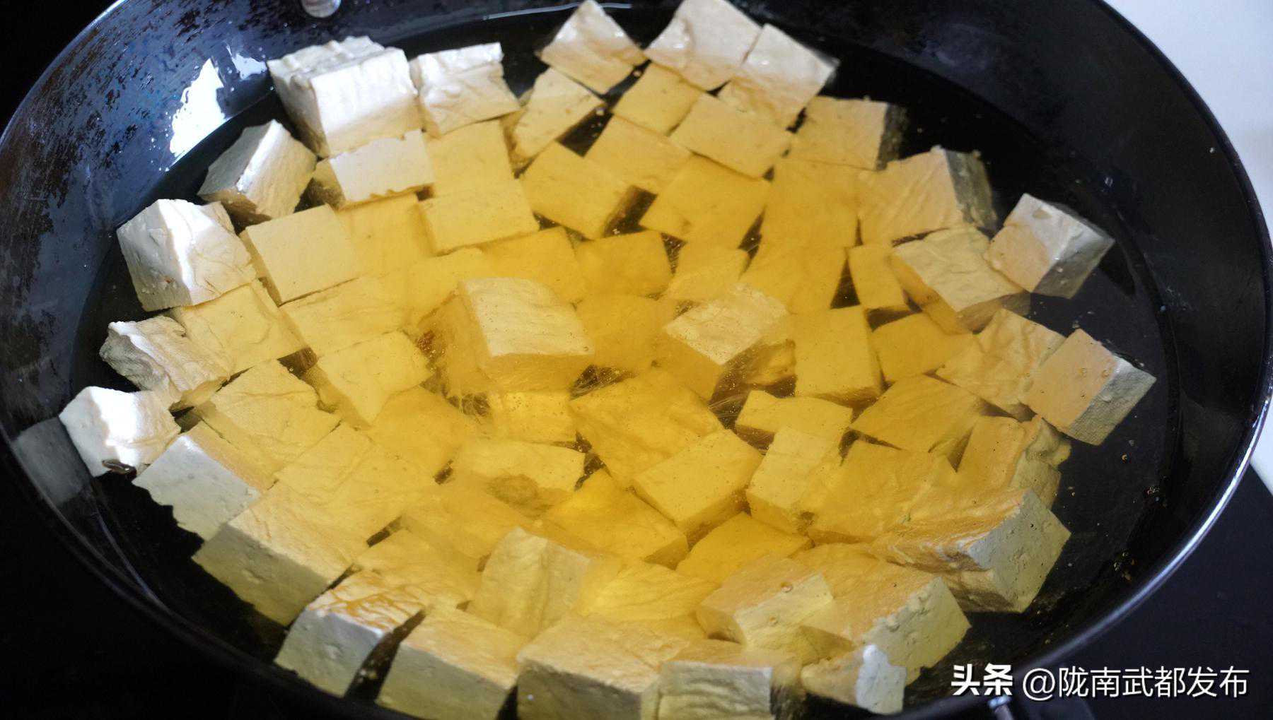 2、全部切好后起锅热油,炸这个豆泡要凉油放豆腐下去炸,大概3层油温就行,用小火去炸。