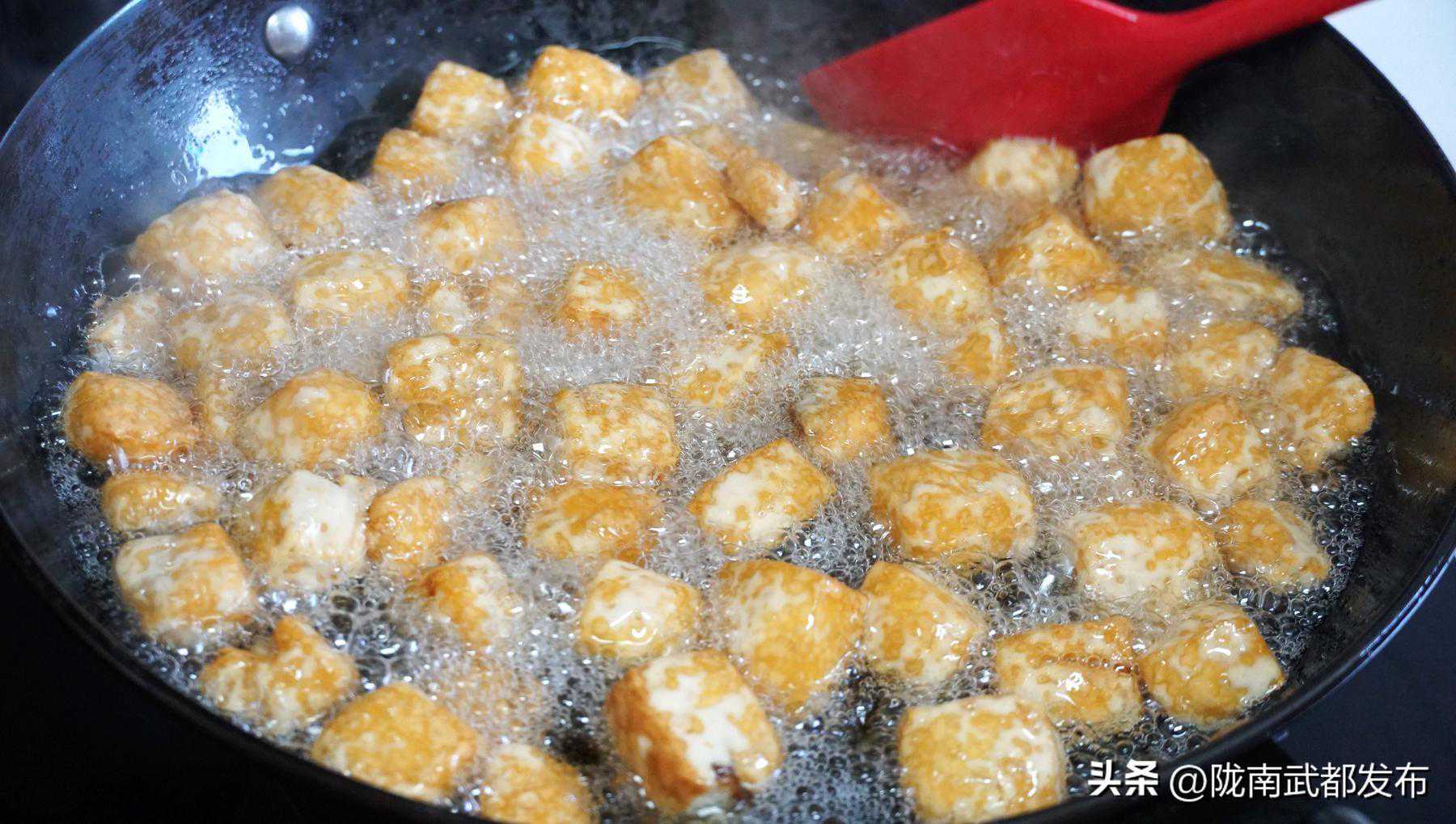 4、让每一块儿豆腐都能受热均匀,慢慢的,豆腐块就开始变得圆鼓鼓的了。