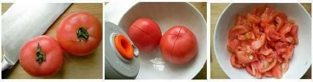 1、西红柿两个,去皮切碎。我直接用小刀削到大碗里,避免损失汁液。