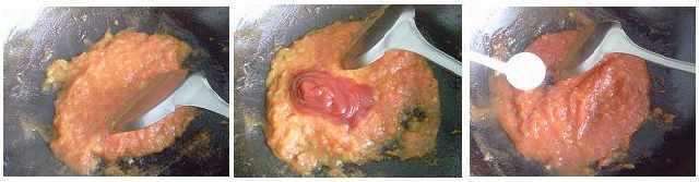3、保持大火翻炒,边炒边用铲子把西红柿切碎,炒成蓉时,加入番茄酱、适量盐和糖。