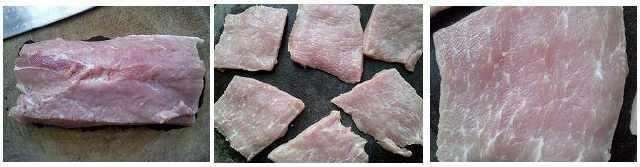 5、里脊肉去掉筋膜,切成约8、9厘米见方的大块,再片成约1厘米厚的大片,可明显见雪花状,肉质滑嫩的必要条件啊软嫩多汁、酸甜不腻的茄汁猪扒