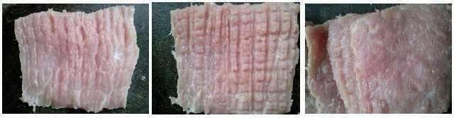 6、取一片肉用刀背或者肉锤将其拍松,肉片明显变大、变薄。依次将所有肉片拍松。