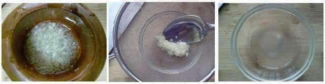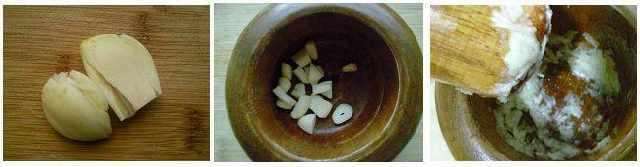 8、加少量清水,浸泡10分钟。过滤出大蒜水,用勺子反复按压,将蒜汁完全挤出后,蒜泥丢掉不要。