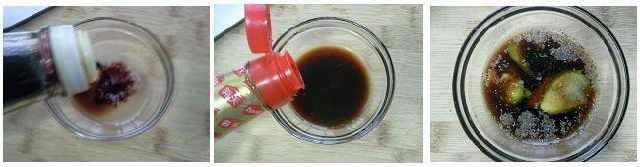 9、蒜汁中加入料酒、生抽、老抽、白糖、白胡椒和数片姜。