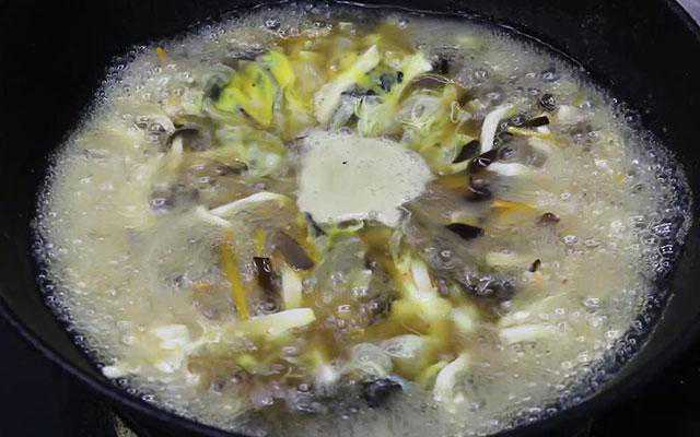 第四步:待锅中水开后下入焯好水的食材,大火再次烧开后,加入适量水淀粉勾芡收汁,汤汁浓稠后再加入鸡蛋液并用勺子轻轻搅动拨开。