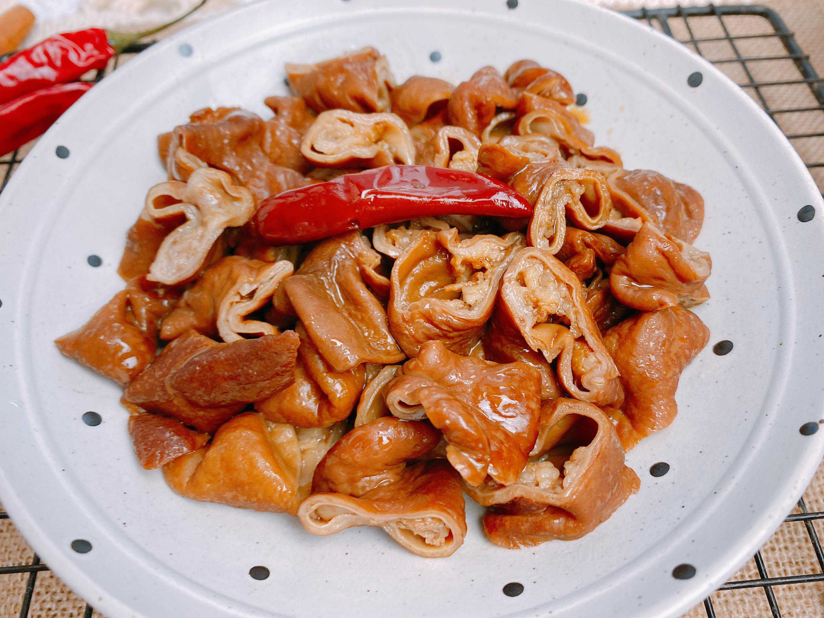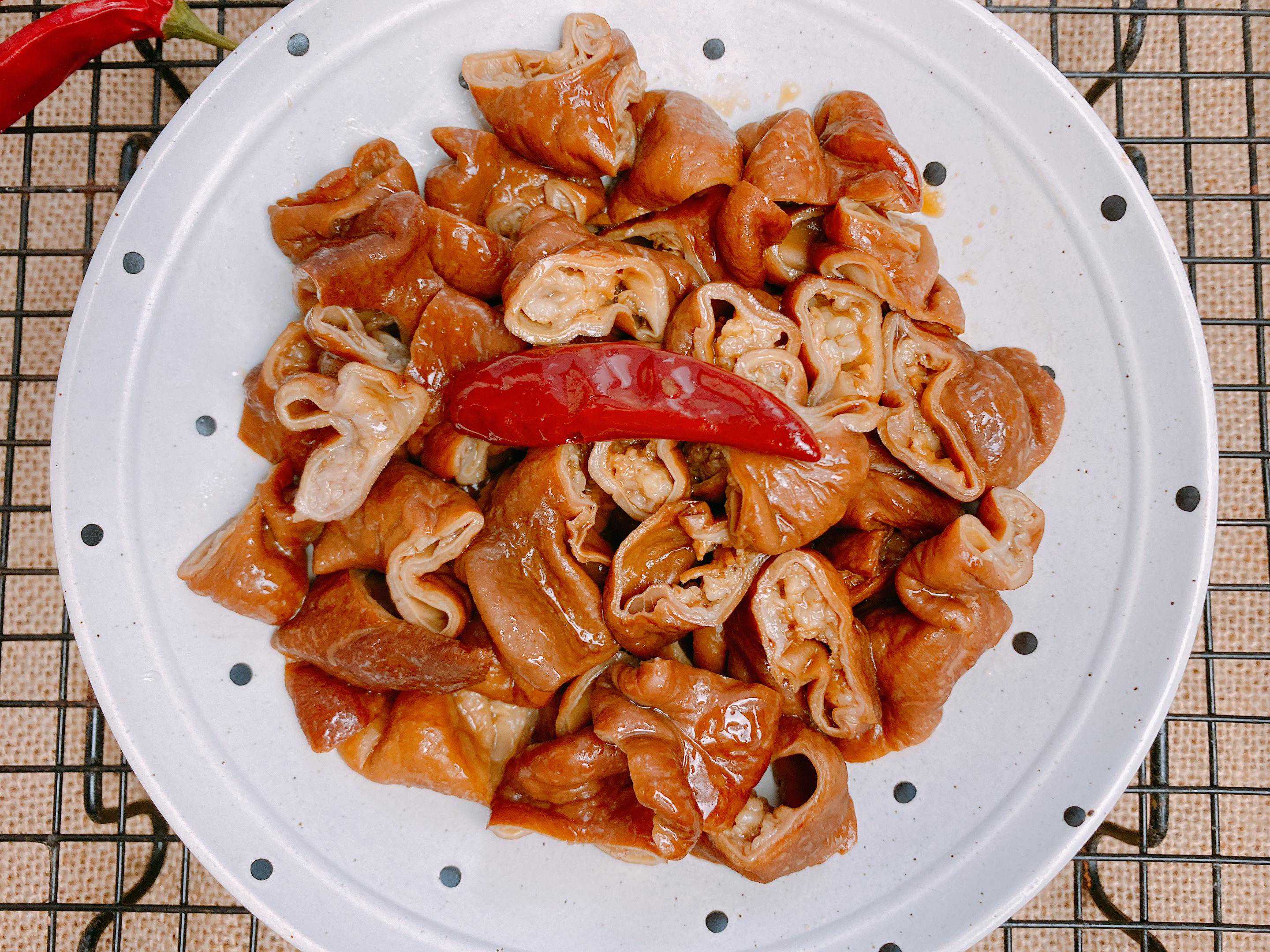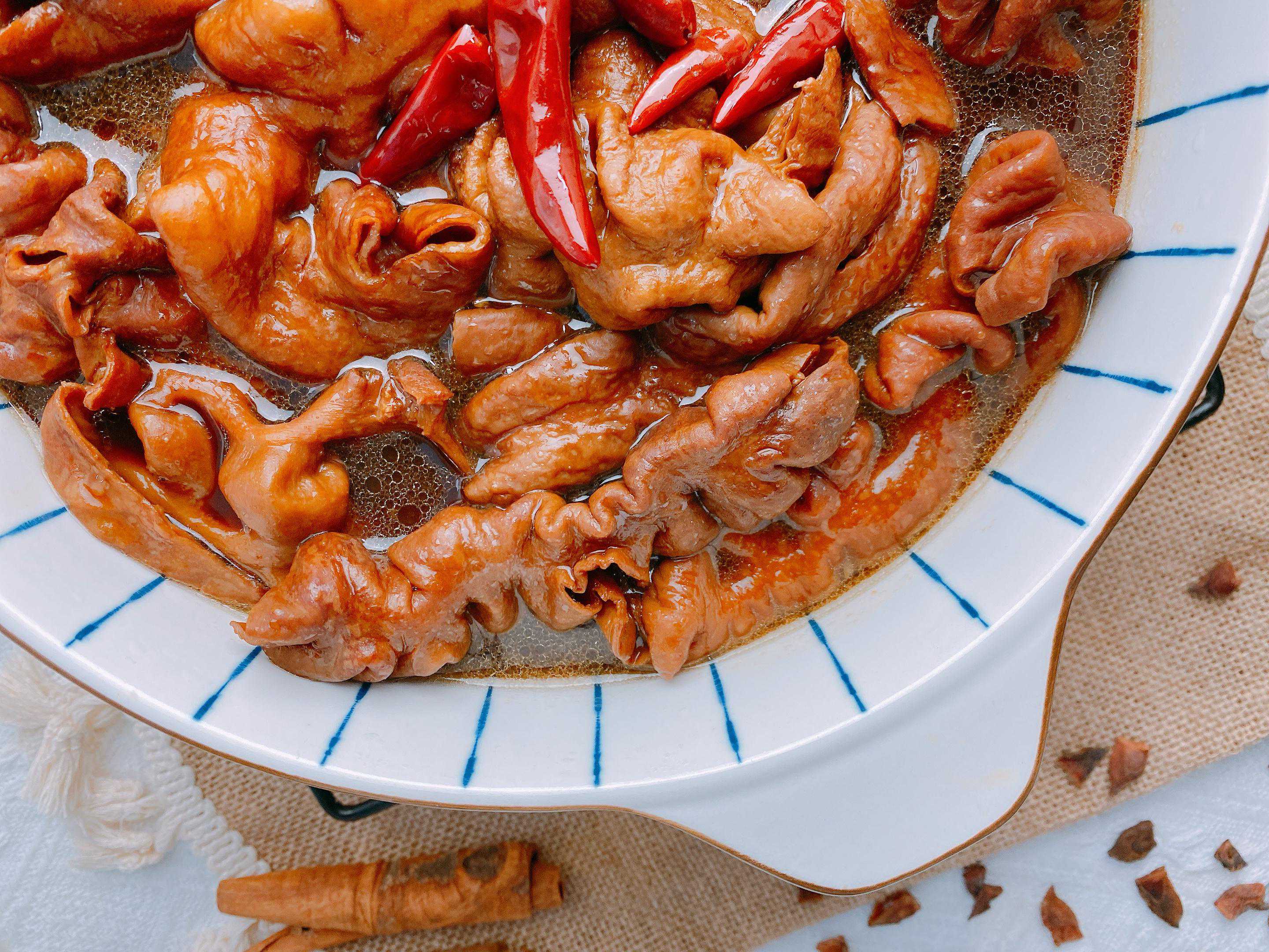 卤的时间很重要,大火煮开之后先保持大火状态煮5分钟,接着转小火继续煮1个小时,这个时间刚刚好,大肠又香又入味,稍微有点嚼劲又不至于软烂的状态。