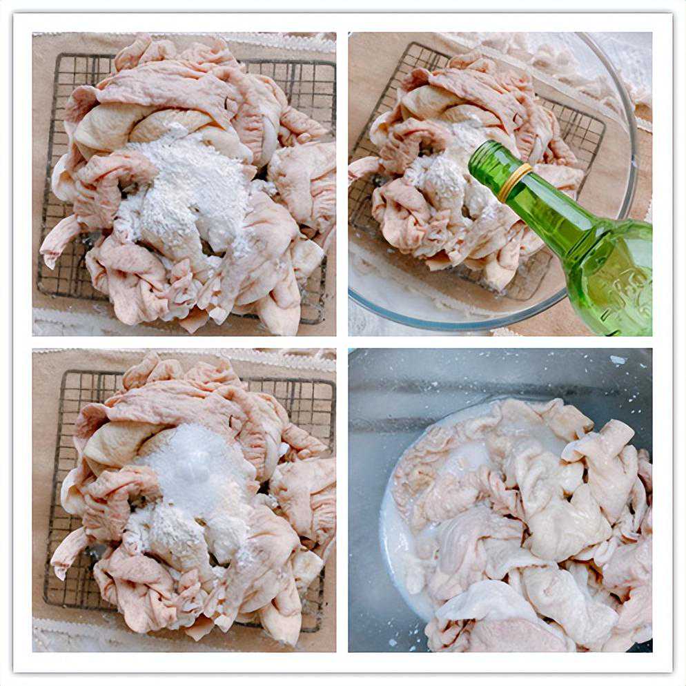 2、猪大肠必须清洗干净,不管是新鲜的猪大肠还是半熟猪大肠买回家之后都要多清洗几遍,加食盐、面粉和高浓度白酒,抓洗表面,反复揉搓,去掉黏液,然后用清水冲洗干净,如果是新鲜的猪大肠需要将大肠翻面,再次重复清洗的步骤。
