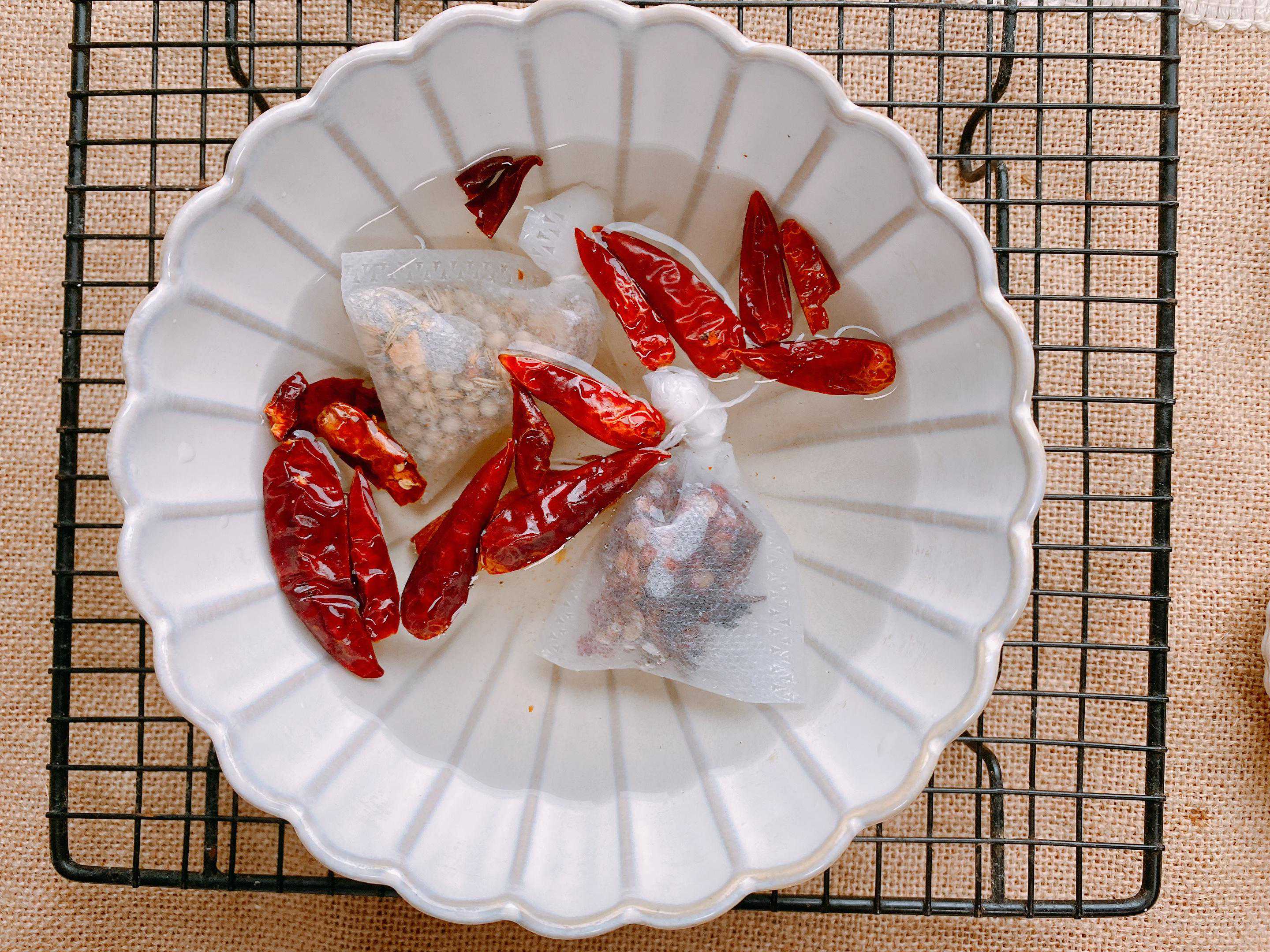 这里用了干辣椒5g、白芷3g、桂皮3g、小茴香1.5g、八角1.5g、花椒1.5g,将除了干辣椒之外的卤料装在卤料包中,并且放在开水中浸泡10分钟。