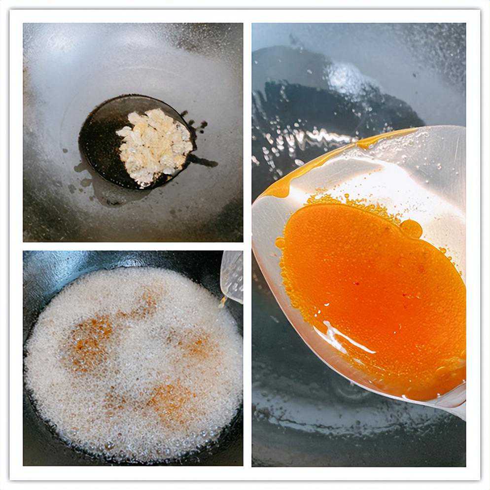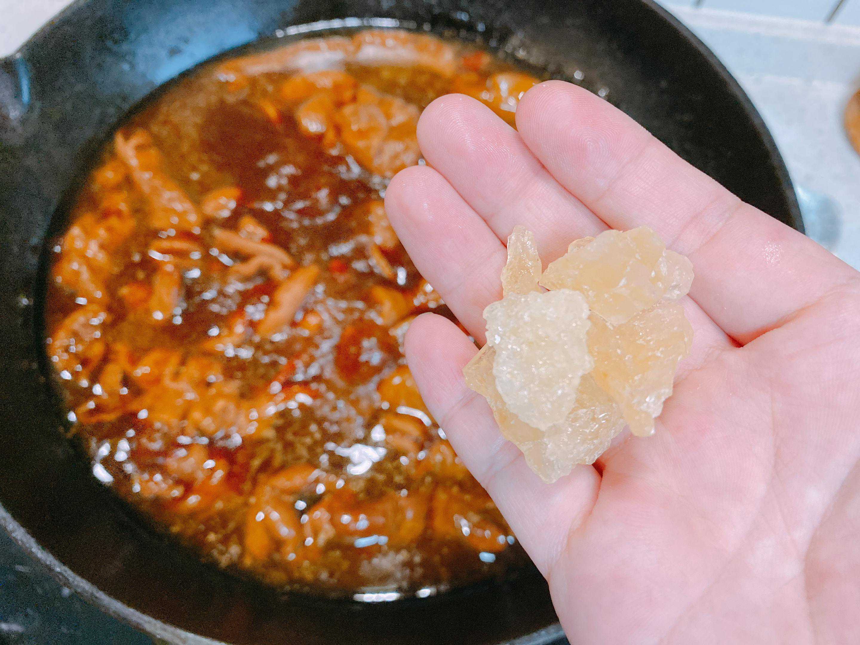 5、接着炒糖色,锅烧热,加入适量的食用油,油温5成热,下入准备好的50g冰糖,小火慢慢炒,炒到冰糖化开,炒至枣红色,冲入适量的热水,大火煮开,这就是糖色。