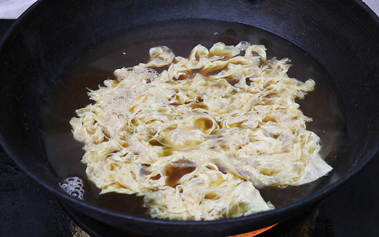第四步:用勺子把锅中汤汁搅匀,再加入适量水淀粉勾芡,用勺子搅匀后开大火烧开,汤汁的厚度和米汤差不多即可;转开最小火,把打好的鸡蛋液下入锅中,待蛋花定型后,用勺子稍加推动。