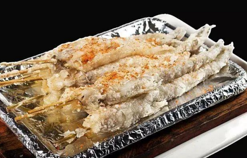 2.将九肚鱼逐一用竹签穿起,裹匀脆皮糊后,下入烧至五成热的色拉油锅,炸至色金黄时,捞出来放铁板上。