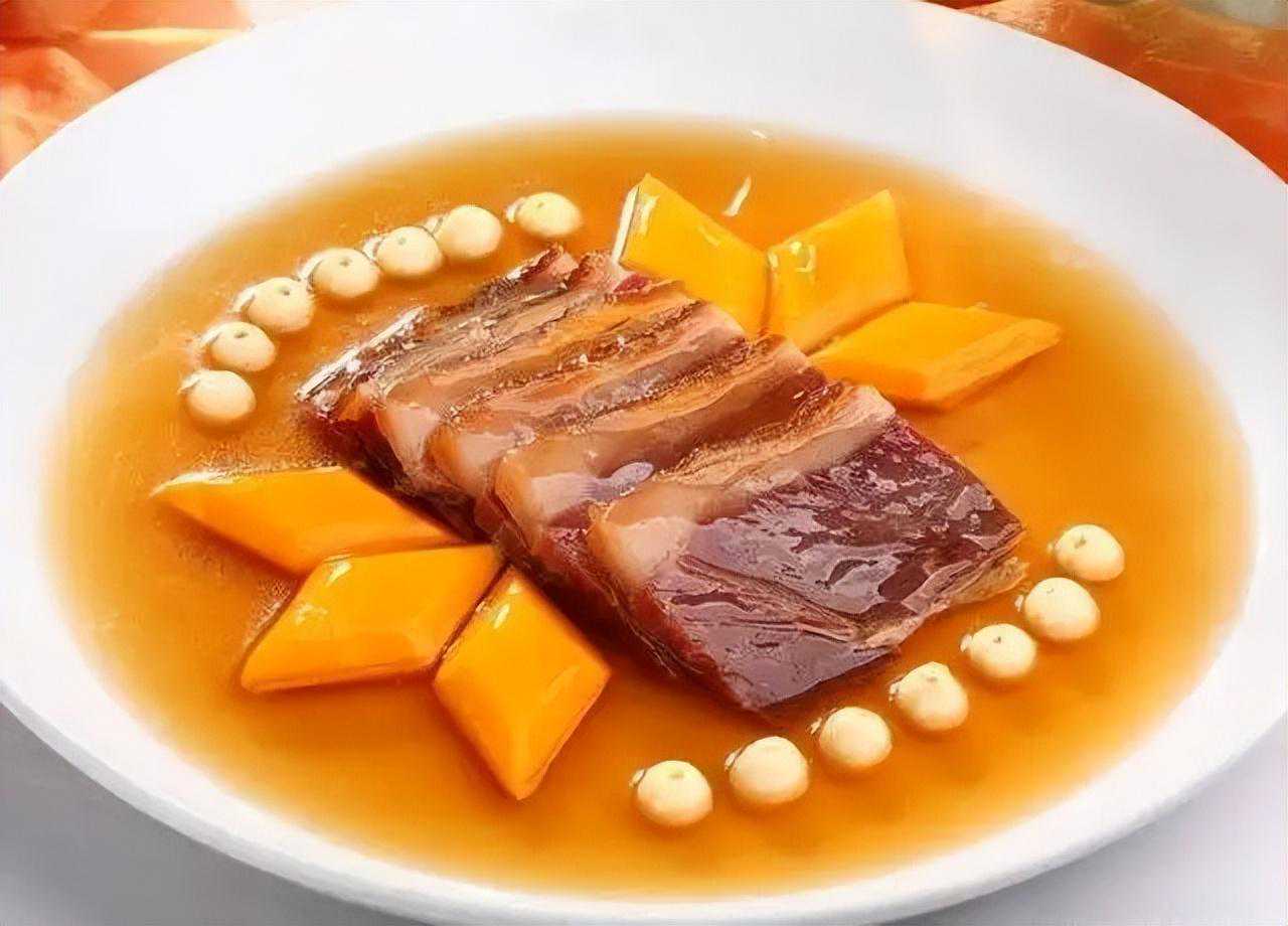 蜜汁火方,这道菜,光是听听名字都觉得有趣。这道菜也是一道浙江的一道传统名菜,采用火腿肉、通心白莲及一些辅料制作而成。