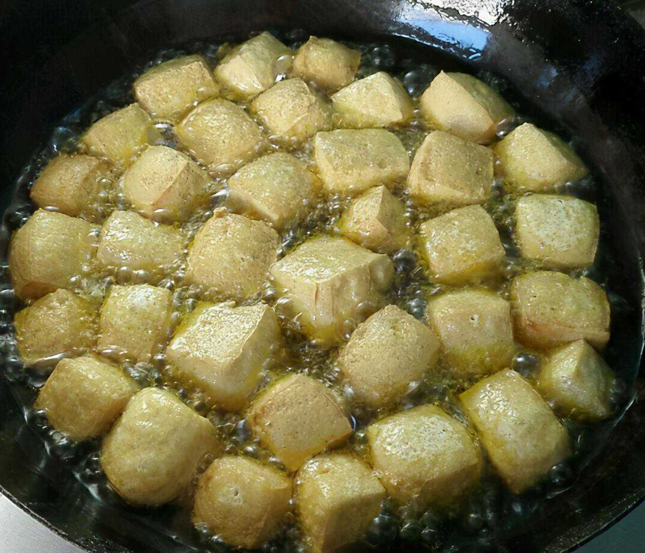 第五步、将豆腐块直接倒入油锅里,用小火炸,下锅后不要动,把表面炸焦后再用铲子翻动,豆腐受热后内部的水分会快速蒸发,豆腐块就会膨胀变大,变成空心的泡状,漂在油面上。当颜色金黄后,继续炸2分钟,让豆腐里面的水分全部蒸发。