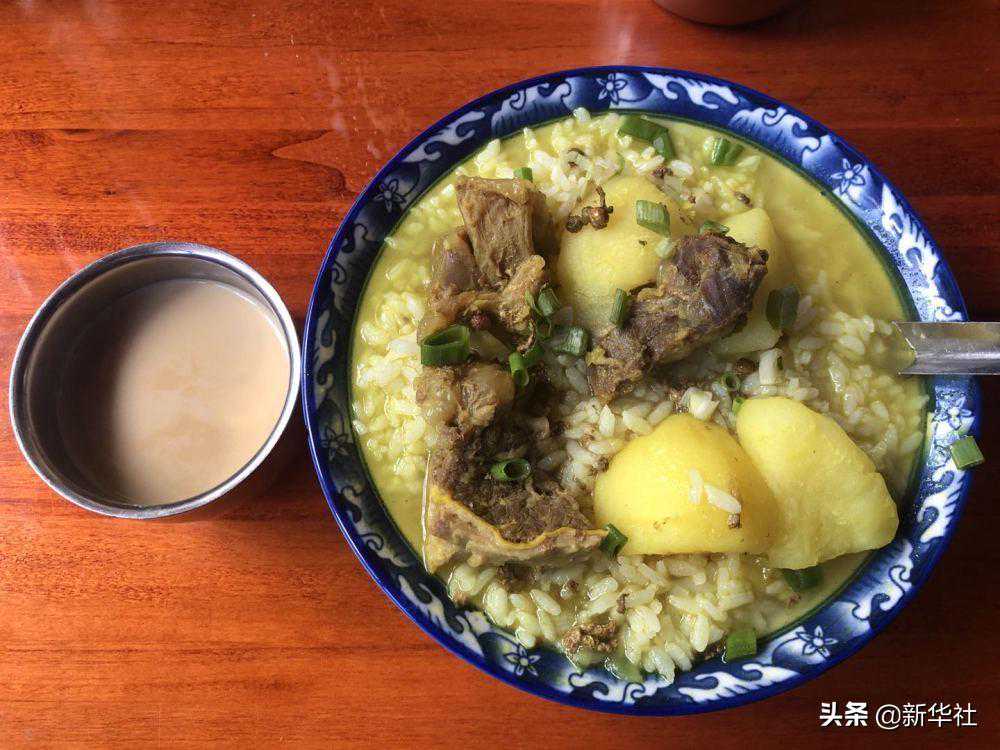 藏餐中的牦牛肉土豆咖喱饭,配一杯甜茶,就是一顿美餐。新华社记者孙瑞博摄