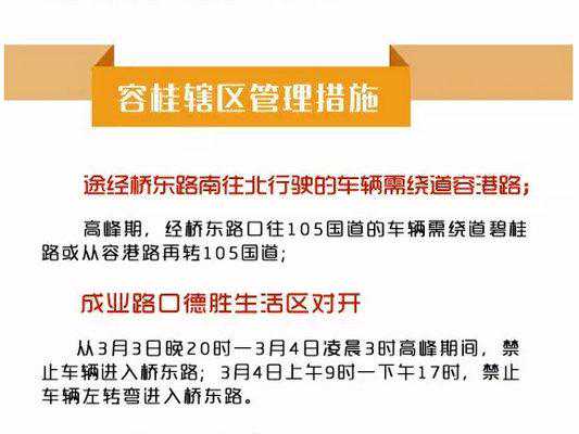 途经桥东路南往北行驶的车辆需绕道容港路;高峰期,途经桥东路口往105国道的车辆,需绕道碧桂路或从容港路再转105国道。