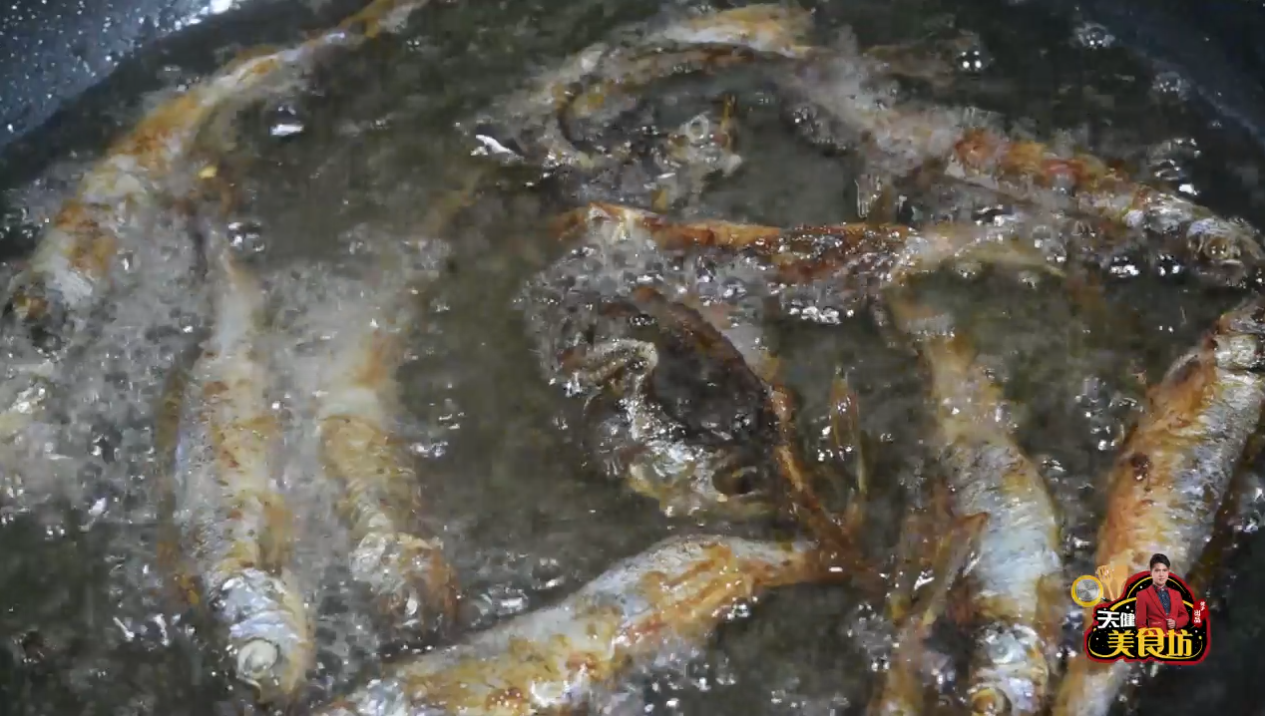 第二步:起锅加入宽油,油温烧至7成热时,将多春鱼一条一条的放入锅中炸至多春鱼定型,然后捞出,再次把油温烧至8成热,复炸15秒,捞出控油备用!