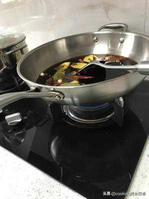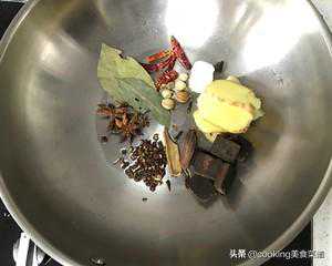 锅内加入香料。生姜一小块、草果一个、香叶3片、桂皮一片、八角2个、花椒10粒、生抽1精灵杯、蚝油1精灵杯、红糖三分之二精灵杯、老抽少许。可根据自己喜好调整。