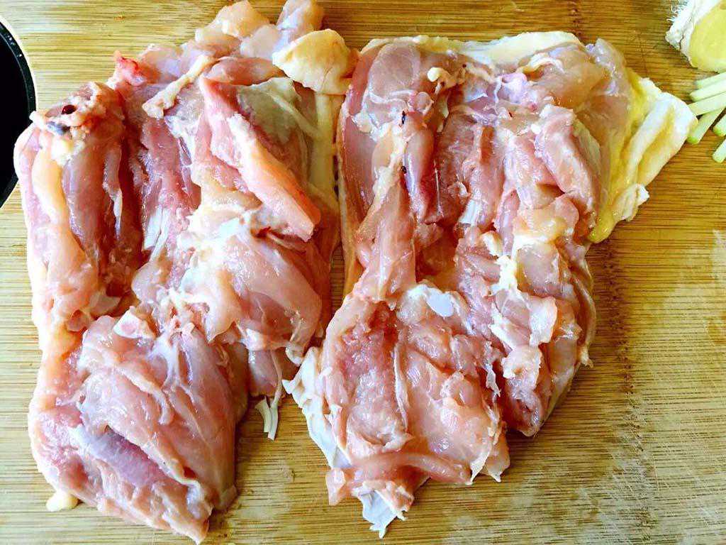 1、首先我们先把买回来的鸡腿肉给剔除骨头以后再切块,这里我选用鸡腿肉主要是因为鸡腿肉质比较多,而且比较的嫩滑,把鸡腿的骨头给剔除以后就完全剩下了鸡肉,吃起来也比较的爽口,所以我们家做鸡肉的话都会比较喜欢采用鸡腿肉来做,当然如果你不喜欢吃鸡腿肉的话可以买三黄鸡来做这道菜。