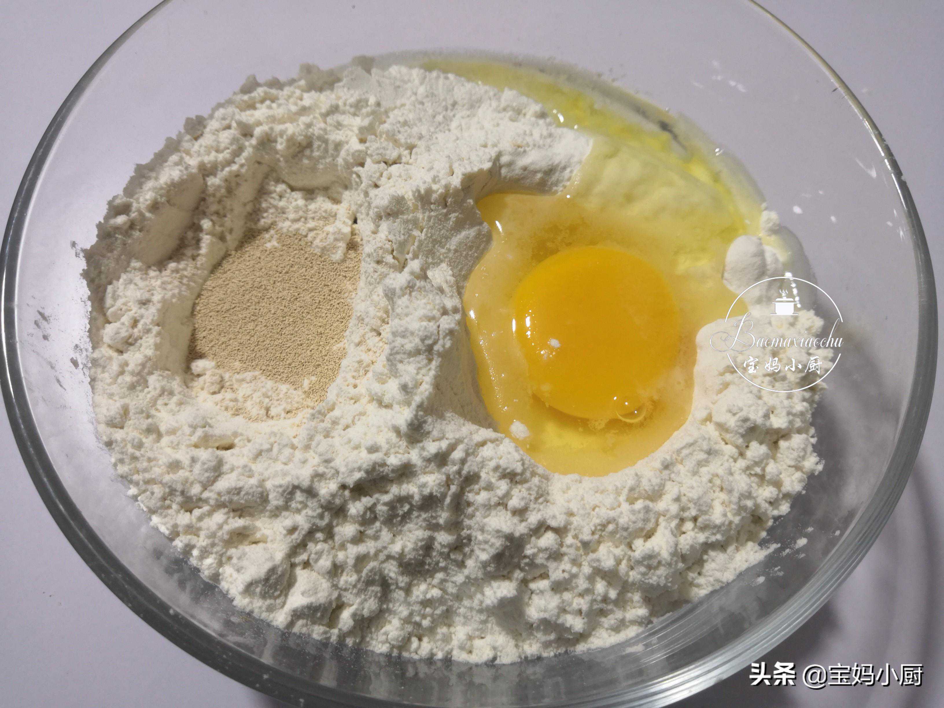 第一步,面粉入盆,挖两个小窝,一窝里放干酵母,一窝里磕入1个鸡蛋,先把酵母这边和面粉拌匀,再把鸡蛋和所有面粉拌匀