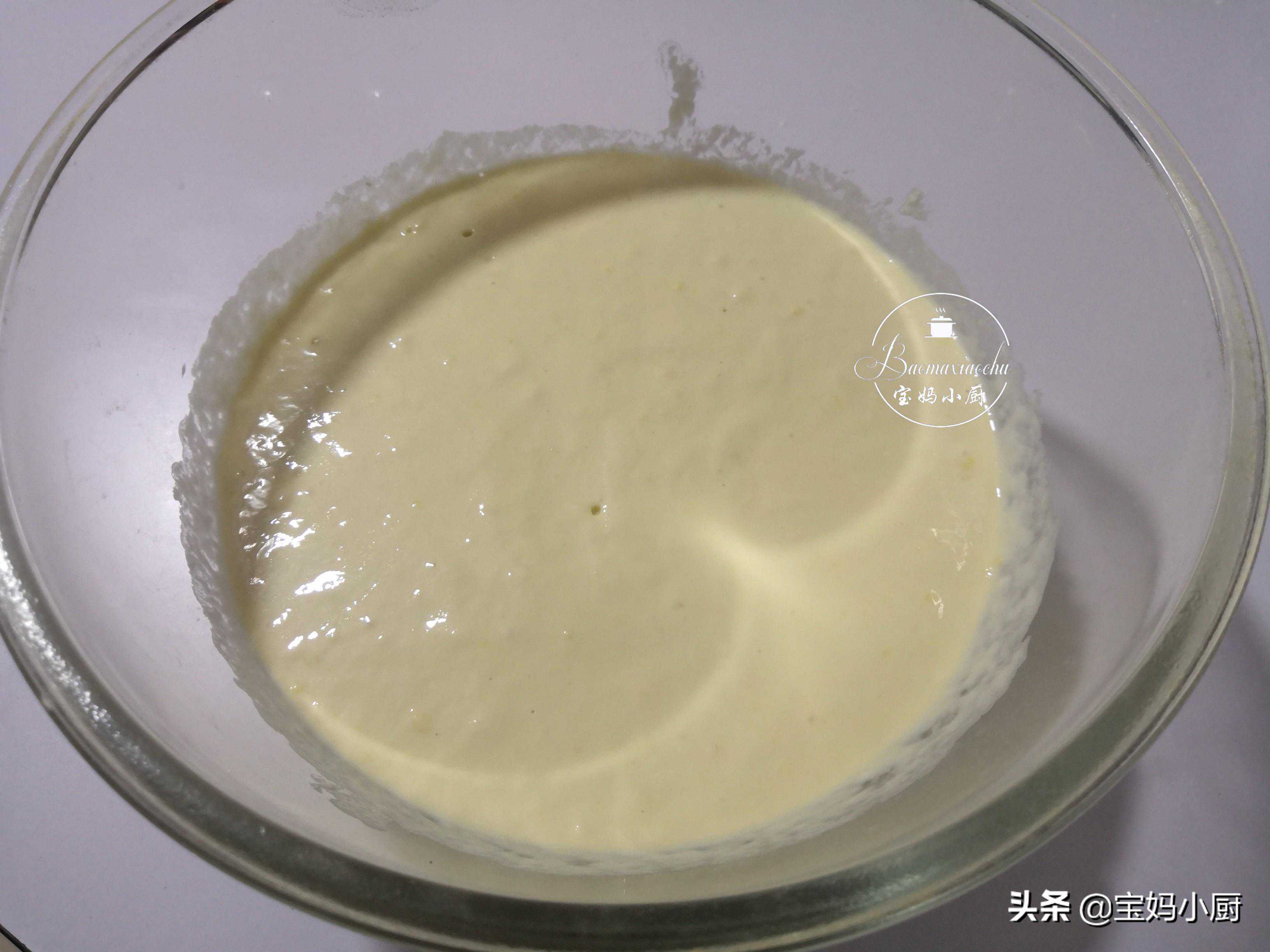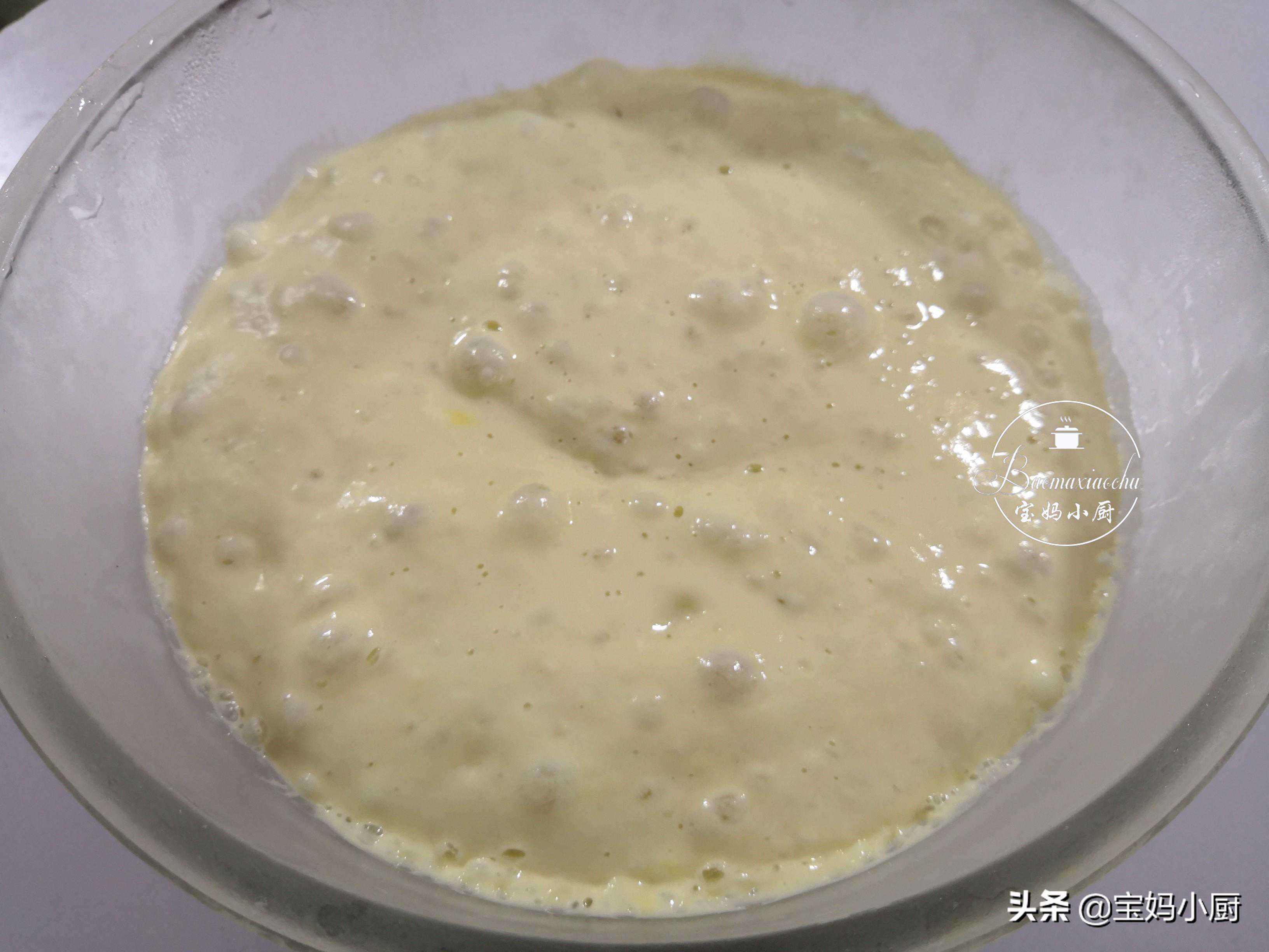 第三步,这是发酵了一夜的面糊,瞧,发的多好,面糊长大了好多,还鼓起好多气泡,这样的面糊就是已经发酵好了,直接用就可以了
