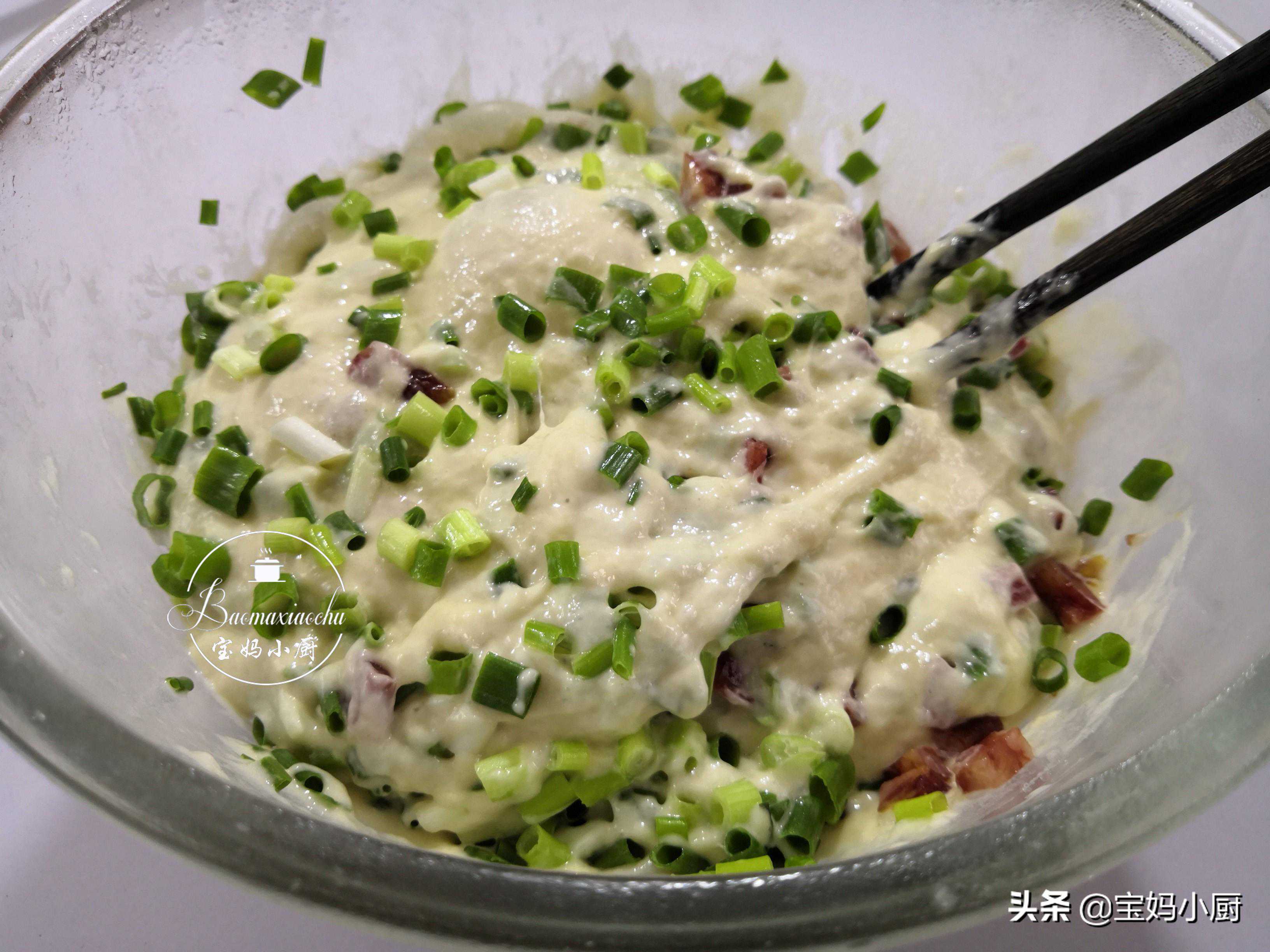 第五步,面糊拌匀的状态,还没入锅,就已经闻到了小葱花和香肠碰撞出的香气了,好香啊,这俩真是绝搭,这里我用的是广式香肠,如果你用别的香肠也不是不行,但是没有这个好吃