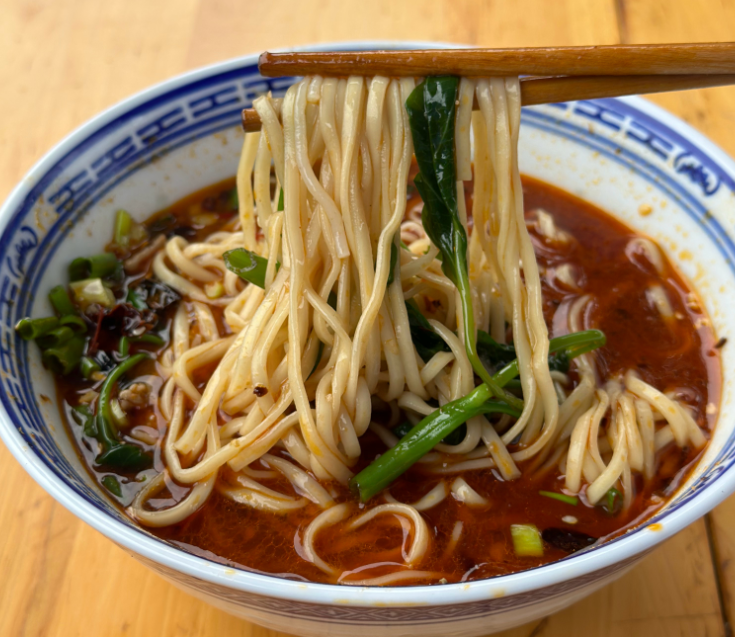 资中兔子面,其底汤采用精心熬制的骨头汤,醇厚而浓郁,面条细而劲道,仿佛是经过千锤百炼的工匠之作,每一口都能感受到匠人的心血与技艺。而点缀在面条之间的各色特配佐料,几片鲜嫩的菜叶,为这碗面增添了一抹生机与活力。而那特制的兔子绍子,更是这碗面的灵魂所在。兔肉满口留香,肉臊软而不烂,每一口都是一次味蕾的盛宴,让人流连忘返。