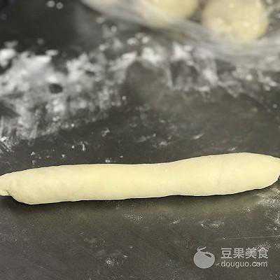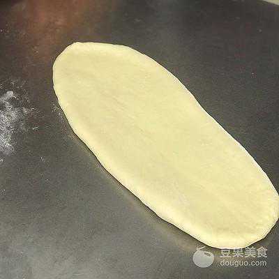 4、发好的面团排气后整成圆形再静止20分钟然后擀成椭圆形。