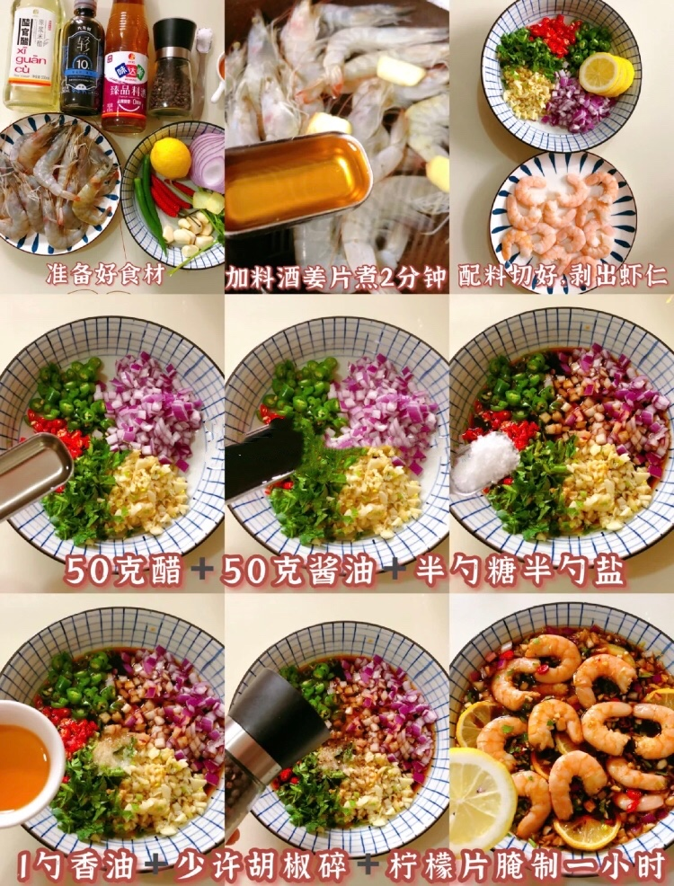 简介节后减脂餐,好吃到嗦手指,非常适合减肥减脂期间吃,零基础零失败,喜欢的宝宝赶紧试一试吧~吃一盘也不胖的:酸辣柠檬虾准备食材大虾,柠檬,青尖椒,小米椒,洋葱,蒜末。1️⃣大虾去虾线➕1勺料酒姜片煮2分钟。2️⃣所有配料切好,大虾剥出虾仁。3️⃣加50克米醋➕50克酱油➕半勺盐半勺糖➕1勺芝麻油➕少许胡...
