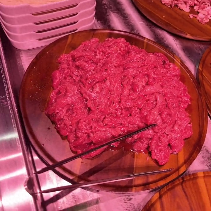 大家现在看到的就是切好的鱼片,厨房进行的摆盘,每一片都在是像蝴蝶一样的漂亮。这边就是先切的牛羊肉,特别的特供的是猪五花,因为有的朋友们不爱吃牛羊肉的朋友们可以来我家尝尝猪五花,五花三层的那一种。今年就是比较瘦一点的肉,就叫做牛肉瘦一点肉的牛肉。