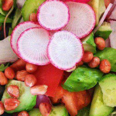 简介把喜欢的蔬菜手撕一下,倒入丘比沙拉汁,简单快手,营养又健康By布丁豆丁妈【豆果美食官方认证达人】用料生菜2片小萝卜四个苦苣1棵洋葱小半个紫甘蓝2片西红柿黄瓜花生米丘比大拌菜沙拉汁做法步骤1、准备原料2、一瓶沙拉汁全搞定3、蔬菜类用手撕成大块,一定要用手撕的才好吃4、西红柿切块或者切片5、放入炸好的花...