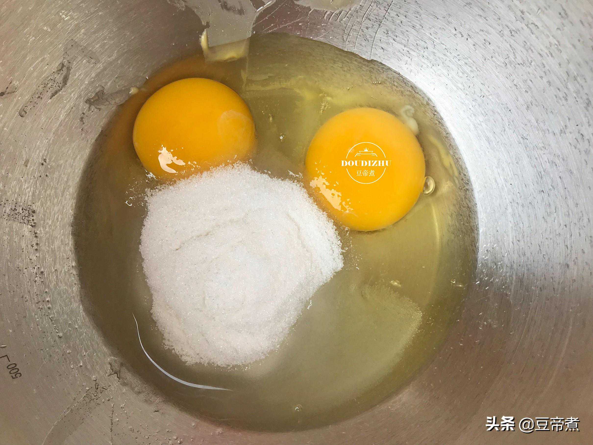 2、把鸡蛋打入盆中,加入细砂糖搅打均匀。