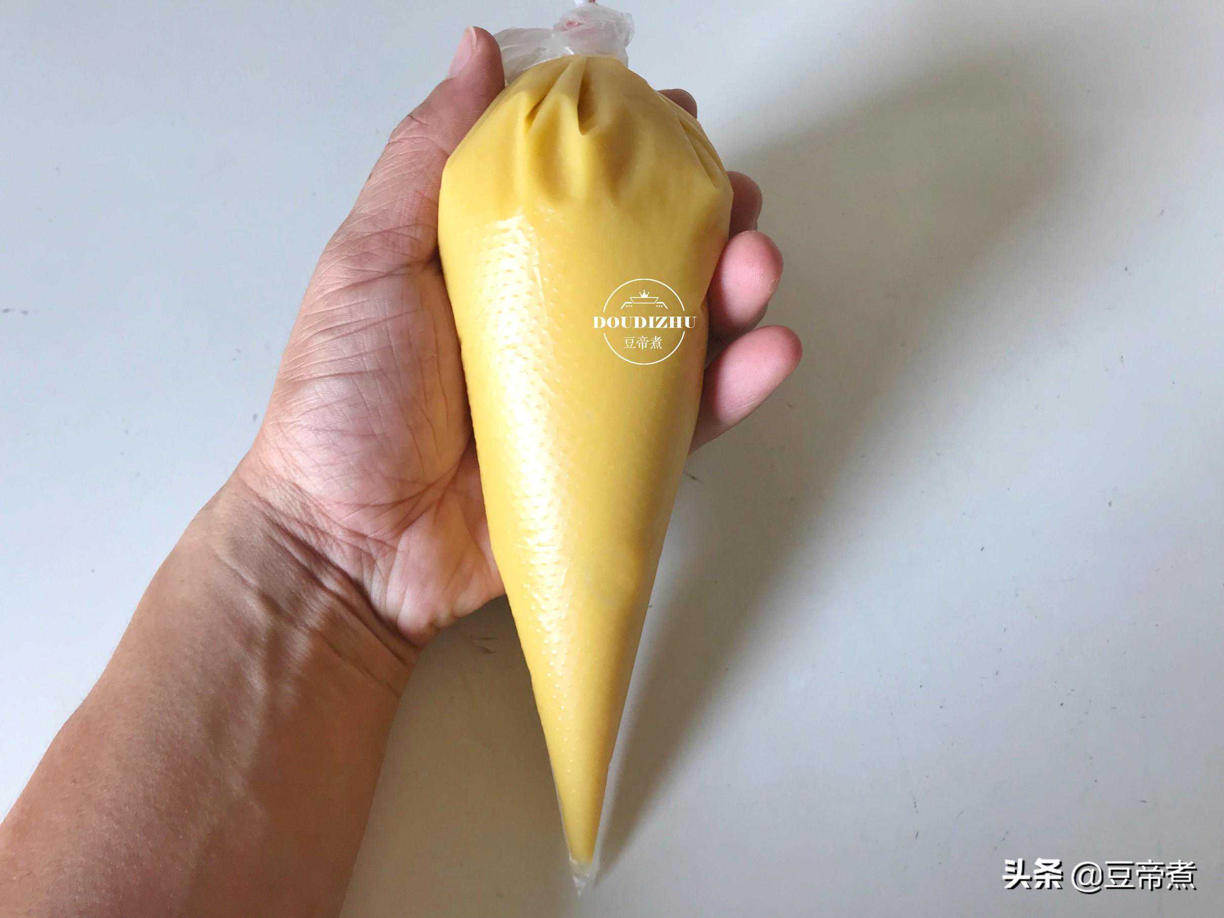 6、在搅拌的时候注意要注意手法,以免起筋。把搅拌好的面糊,倒入裱花袋中密合封口放入冰箱冷藏一个小时以上。