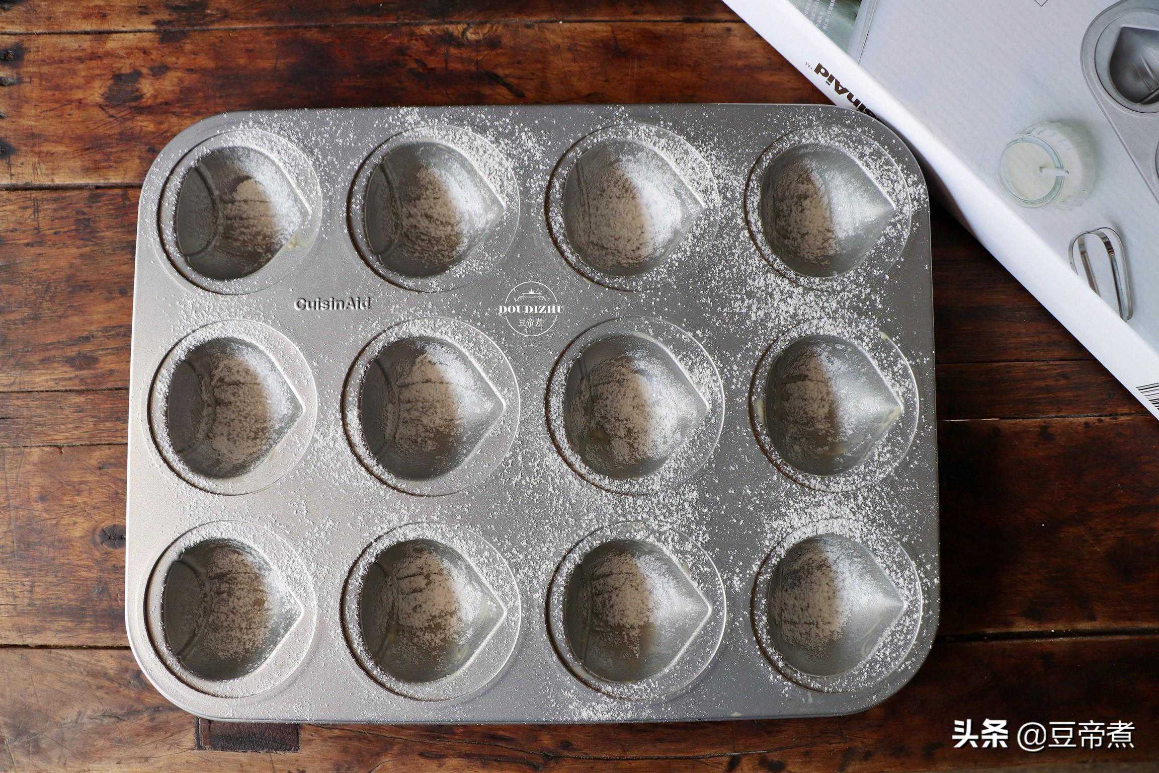 7、在准备烘烤的时候,面糊要提前半小时拿出回温。然后拿一小块黄油在模具上涂抹一层,最后撒点低筋面粉防止粘底。