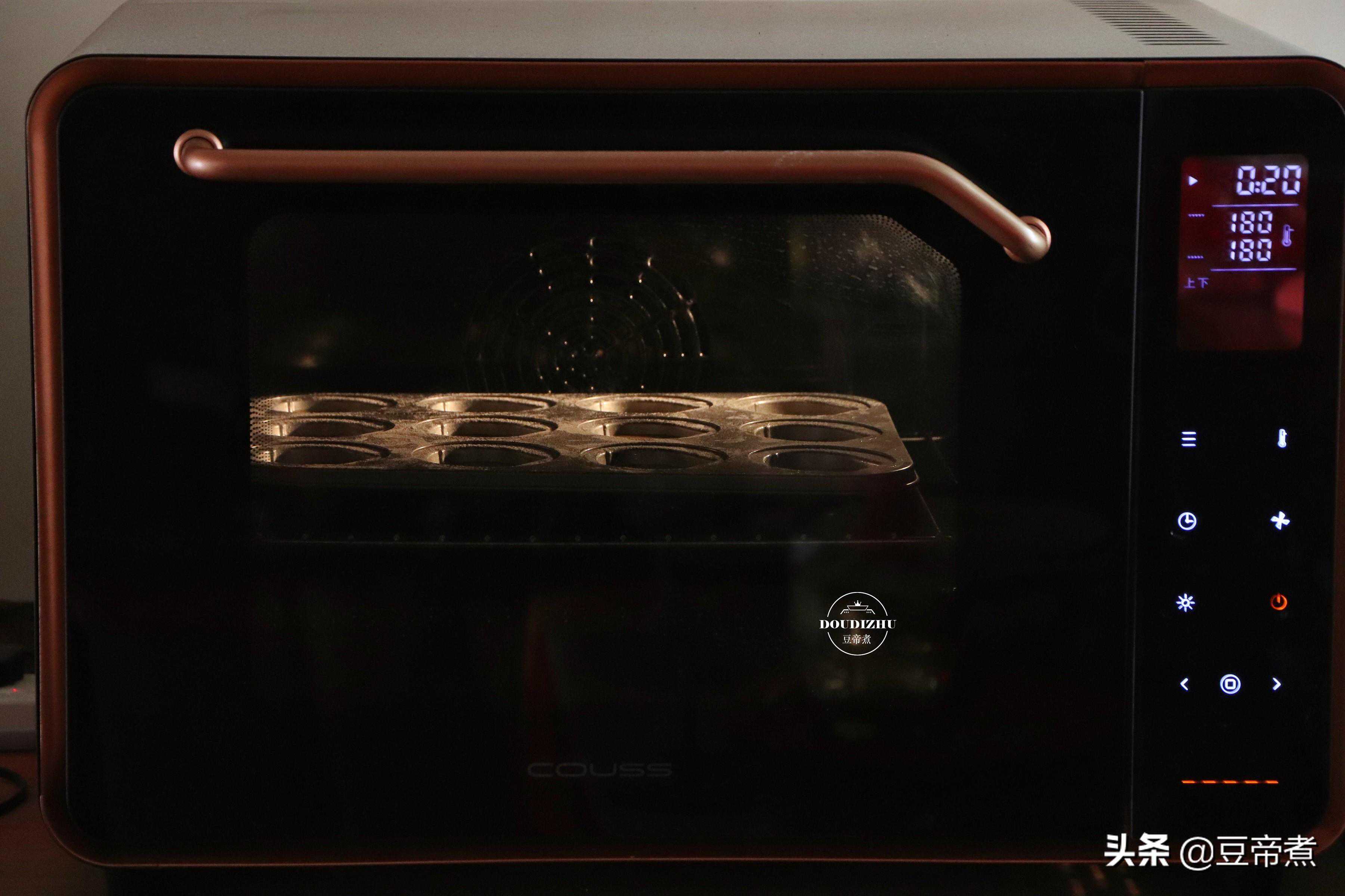 9、拿起模具摇晃并震两下,然后放入烤箱烘烤。烤箱提前预热180度,上下火中层烤制20分钟即可出炉。(时间与温度请根据自己的烤箱特性做出适当的调整)