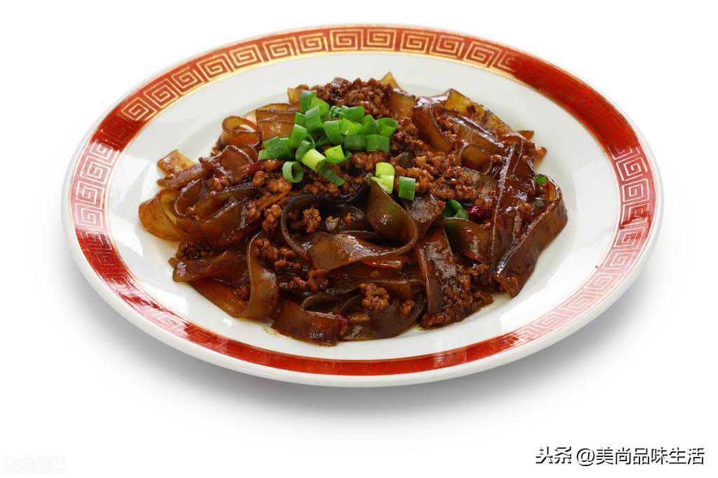 13、肉末蕨根粉宽蕨根粉煮熟后冲凉,放入盘中,拌少许麻油。热锅凉油炒肉末,炒熟时,加入生抽、老抽、蚝油、盐和胡椒,拌炒均匀后,出锅倒在蕨根粉上,撒上葱花即可。
