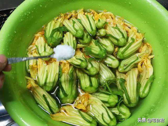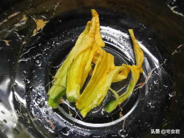 1.清洗南瓜花,和大部分花一样都依靠艳丽的颜色和特有的味道来招蜂引蝶,她们采完蜜之后或多或少会留下一些脏东西在花苞里,我采用盐水浸泡的方法清洗,整剁花浸入清水中加适量的盐浸泡20分钟左右。然后再一朵一朵的来回在盐水里涮几下之后用清水冲洗干净沥干水备用。