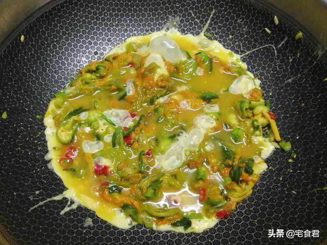 5.加少许盐调味,关小火然后把蛋液均匀的淋在南瓜花上用锅铲摊开感觉鸡蛋8成熟的时候再用锅铲或者筷子打散撒上葱花就可以出锅尽情享用了。