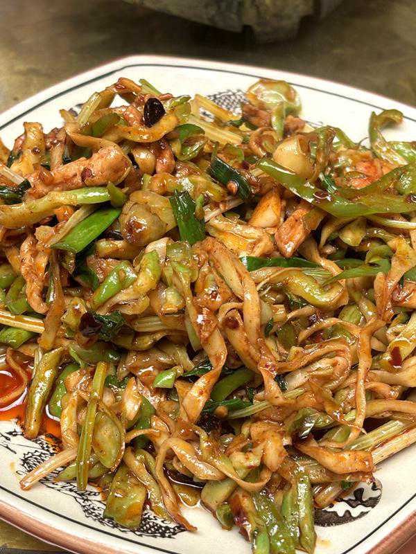 卖相,真是清澈。湖北人真会吃,带皮的细榨菜丝,腌渍几天后压出水分,阳干时收起保存。吃前洗净泡发,起锅下猪油放豆豉和大蒜碎,慢慢滑散榨菜使其均匀入味,途中再放入芹菜梗、新鲜大蒜段、五花肉丝、青红椒丝同炒,起锅前滴入酱油、淋入生抽,再窊一小勺红油辣子同炒,满满一大盘,不可谓不锅气十足啊!