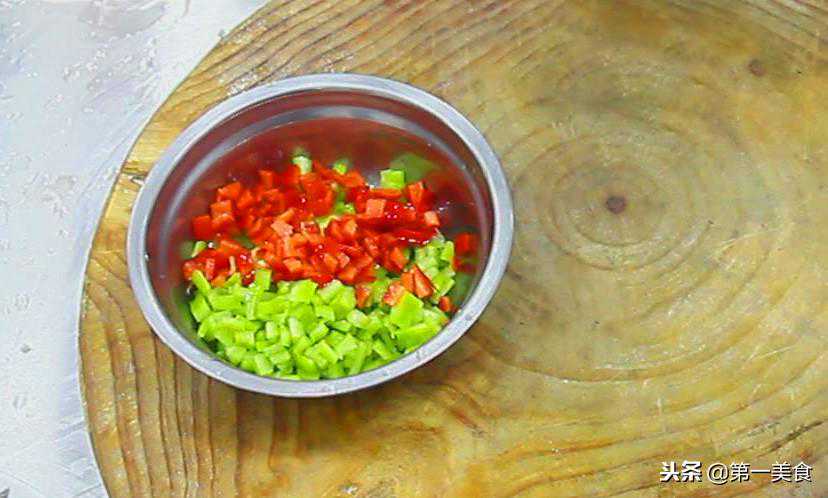 青椒去籽后先切成细丝,再切成比较小的颗粒。红椒半个去籽后切成细丝后,同样切成颗粒,青椒红椒配在一起,用来配色比较好看。