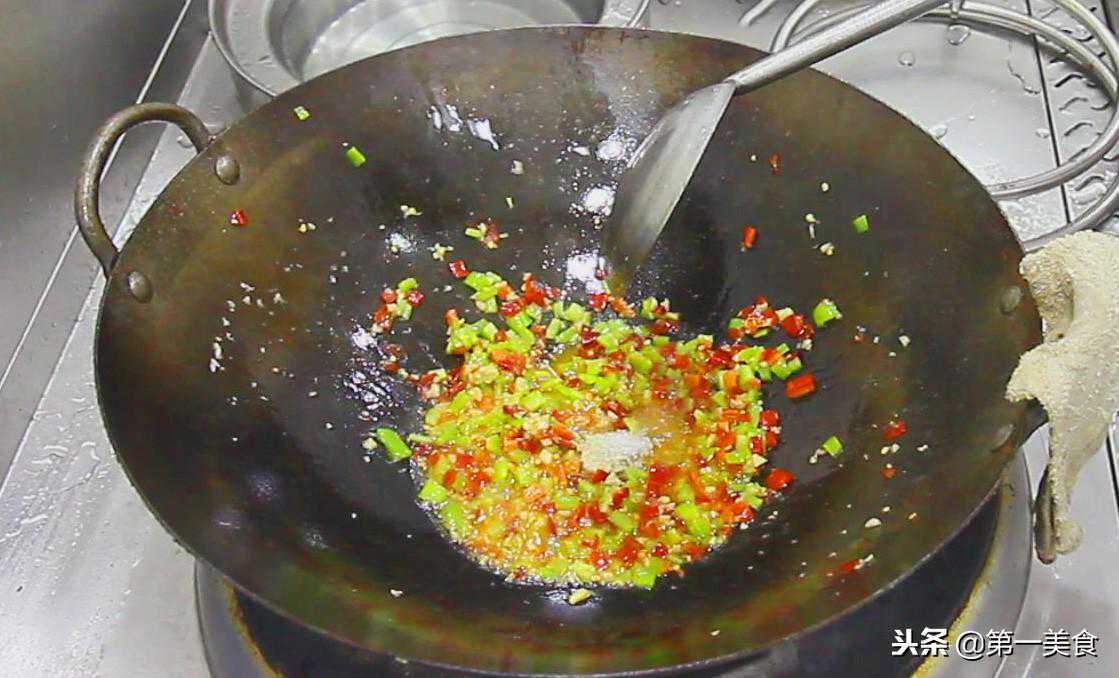 锅内烧油,油热后倒入蒜沫,剁椒,翻炒均匀,因为剁椒的咸味太重,我们把剁椒和青红椒炒在一起。中和一下咸味,倒入青红椒继续翻炒。
